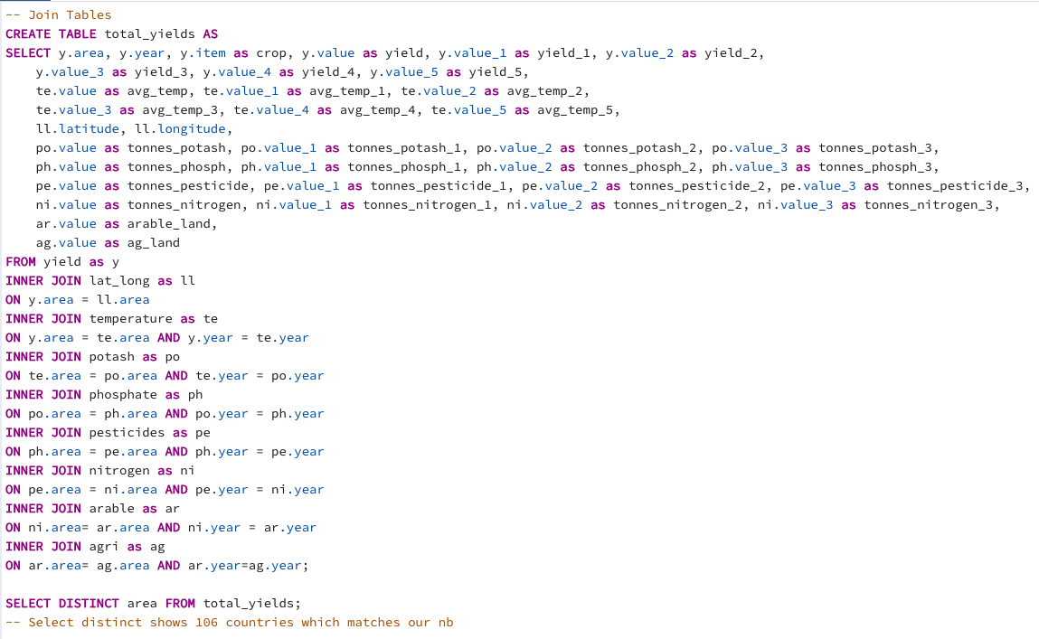 The purpose of this analysis was to complete a full group project from data and topic selection to EDA and data analysis, database creation, and database connection to machine learning model. The results were then displayed in a Leaflet map and on a Tableau dashboard. The project was presented as a group with Google slides. The project analyzes crop yields from countries around the world and predicts crop yields based on a number of features with a multivariate linear regression model.